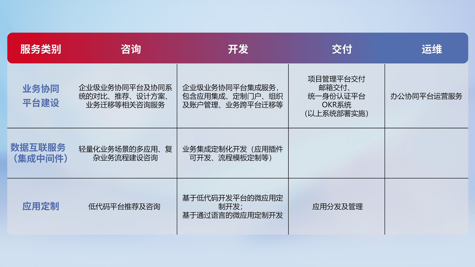 针对钉钉、、、企微、、IDaas等平台级产品提供产品的规划、、方案、、交付、、、定制化开发等服务,,,实现如统一协同办公、、、、智能客户服务、、、混合会议管理、、、、智能数据查询、、等业务场景,,,实现数字化转型。。。。