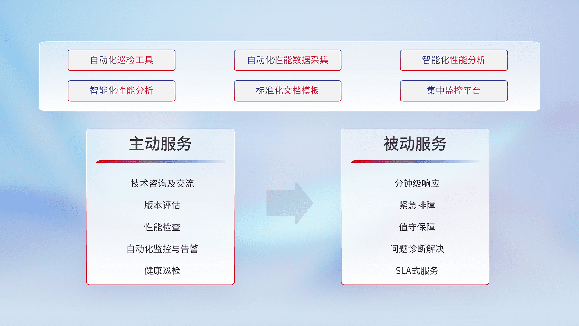 智能化工具和标准化文档,,保障服务质量,,,,提供主动服务(包含技术咨询、、、版本评估、、性能检查、、自动化监控与告警、、、健康巡检)和被动服务包含(分钟级响应、、、紧急排障、、、值守保障、、问题诊断解决、、SLA服务)。。